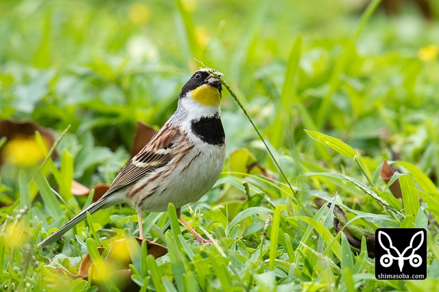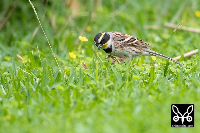 芝生に生える草の種をついばもうと背伸びするミヤマホオジロ。