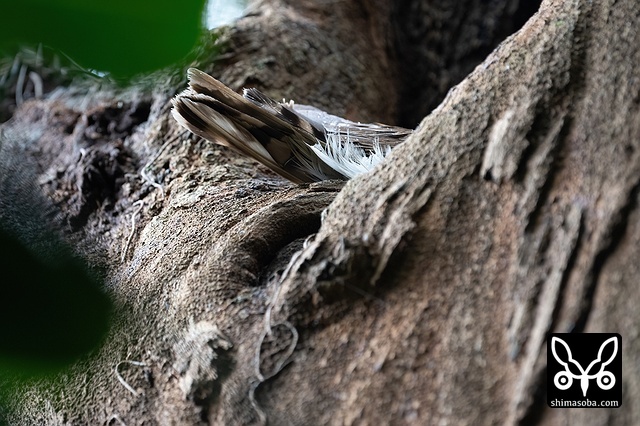 なんと巣の中は丸見え。この樹洞は、今から7年前の `2014年にアカショウビンが掘った場所 <https://shimasoba.com/blog/473/>`_ です。昨年の台風で折れたことから危険と判断されて切断されました。毎年、丸見えになるようなところを巣にするペアです。^^;