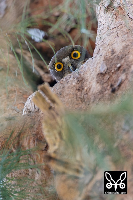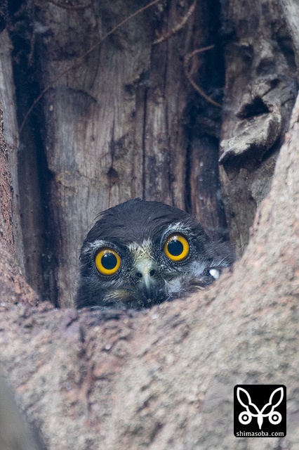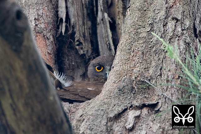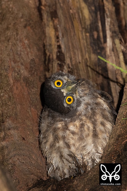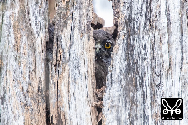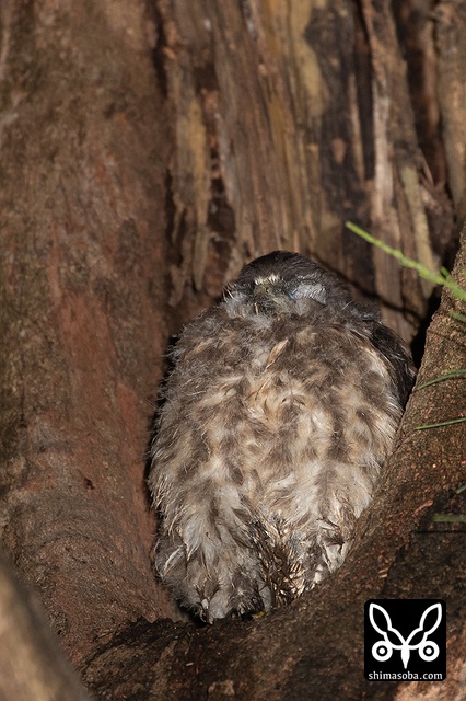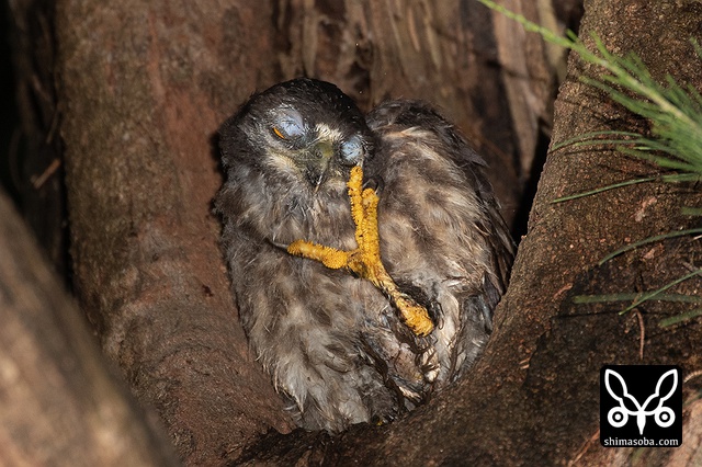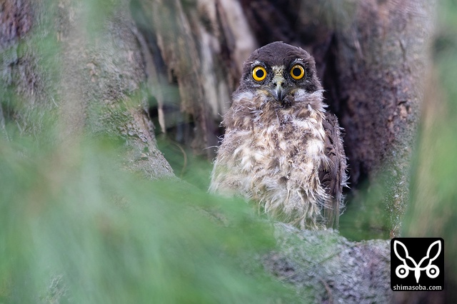 昨日とは違う営巣地。巣立ち後、3日ほど経っていると思われるアオバズクのヒナ。巣にいるころは複数羽確認できたのですが、巣立っていたのは、1羽だけ。親鳥も1羽だけだったので、どこか見つからないところにヒナと親鳥はいると思われます。
