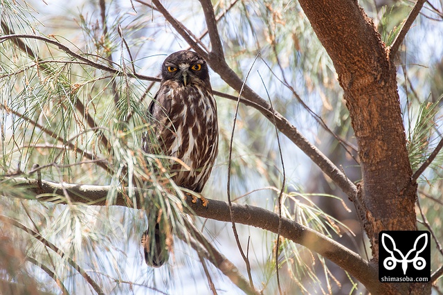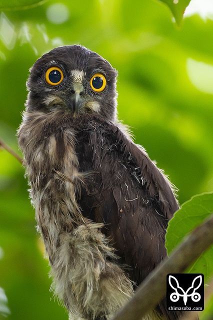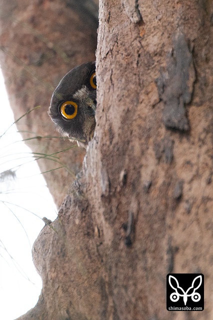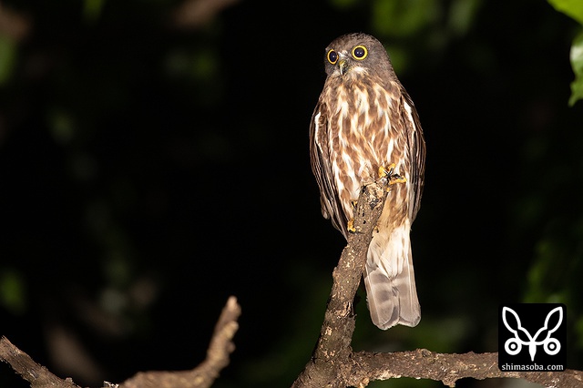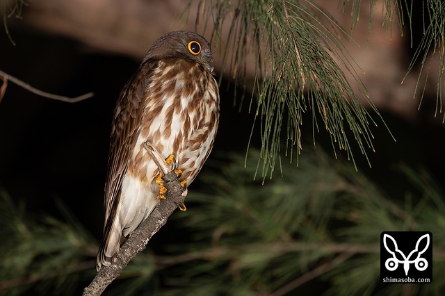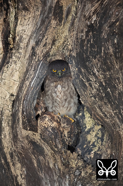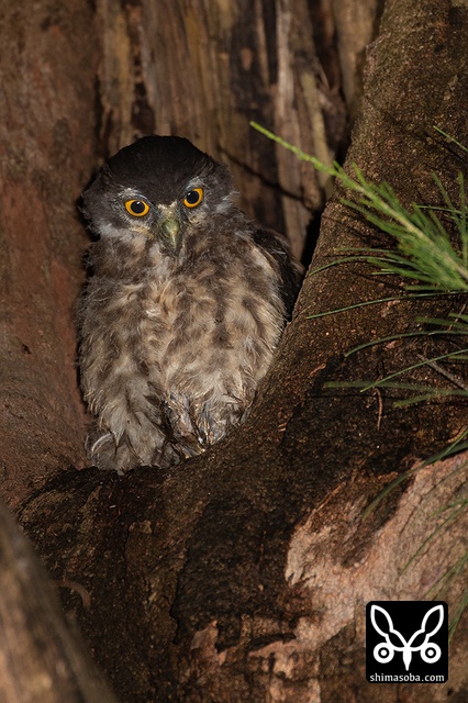 メスのアオバズク。昼間、羽毛の流れが乱れていたが、夜には、きれいになっていた。ヒナの成長に伴い、今日の昼に樹洞から出てきたのだろうか? 普通は、夜に出るもんだと思うんだけど…。頭にシラミバエが乗ってる…。^^;