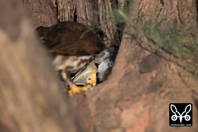 巣から飛び出したメスは無事に帰ってきて抱卵に戻りました。一安心。物陰に隠れながらの撮影でしたが、こんな時、シャッター音を小さくする「ソフト連続撮影」が役に立ちました。アオバズクは、こちらの気配に全く気づくことなく巣に入りました。^^