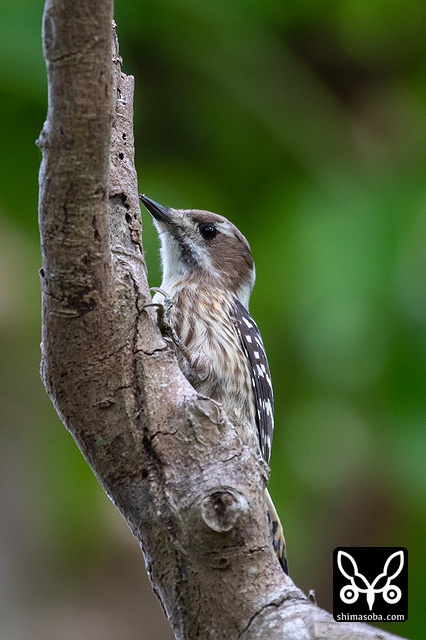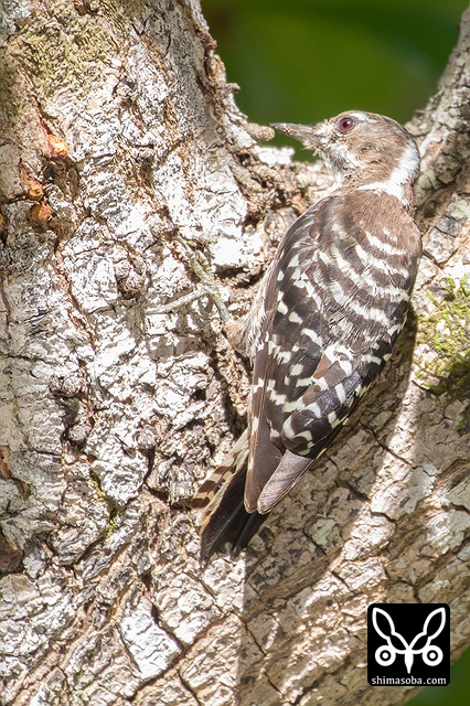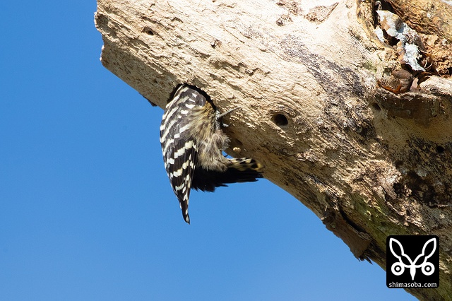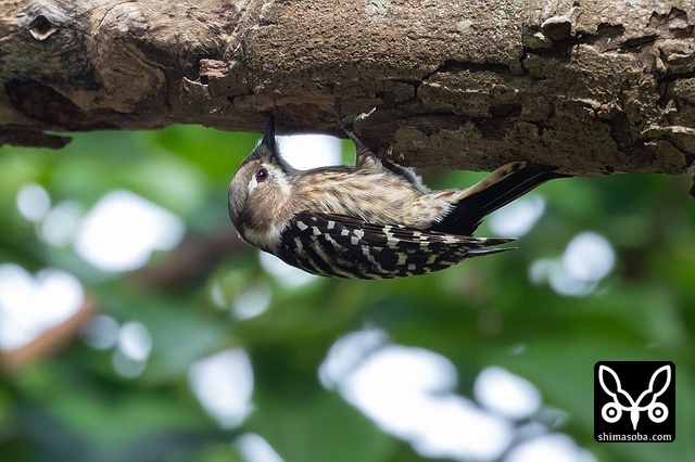 逆さまになり、コバテイシに潜む虫を探すリュウキュウコゲラ。
