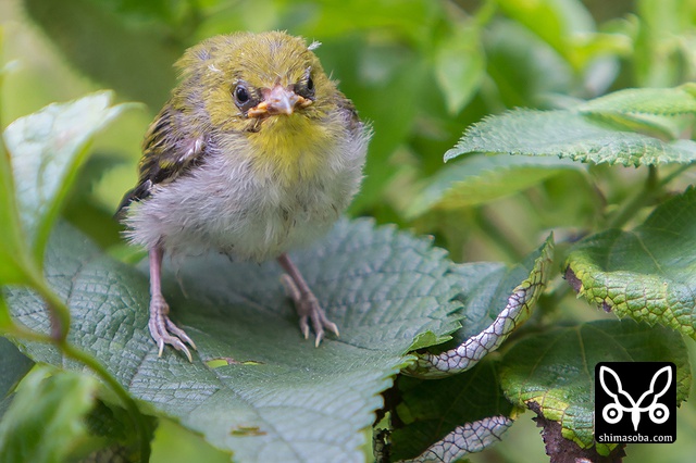 葉っぱの長さは4センチほど。メジロの巣立ち雛は小さくて色合いも緑なので少し目を離すと見失います。