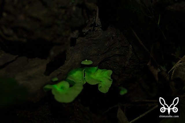 アミヒカリタケの発光はかなり強いです。^^ 明日はもう枯れていると思う。 私の身長(180cm)より高い場所に生えていました。脚立があればよかったかな。^^;