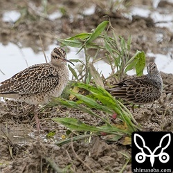 4月15日に確認されたアメリカウズラシギ は滞在5日目となりました。ウズラシギの群れの中で過ごしています。秋の幼鳥の記録がほとんどなので、春の成鳥は貴重です。