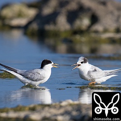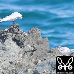 求愛するエリグロアジサシ。右の個体には青いフラッグが付いています。