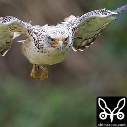 カンムリワシ幼鳥の急降下。ブレーキをかけ始めているので小翼羽がピンっと立っています。