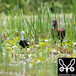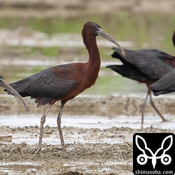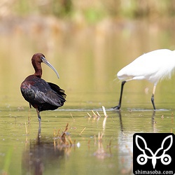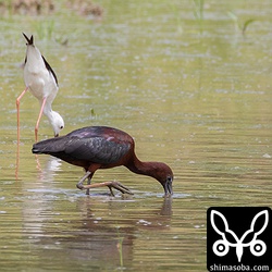 ブロンズトキと後ろのセイタカシギの大きさはそれほど変わらないように見えます。