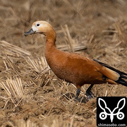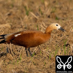 刈り取り後の田んぼにアカツクシガモのメス成鳥が飛来しました。
