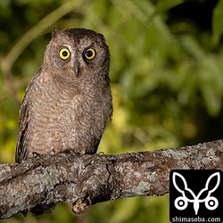 身をかがめて何かを警戒し注視しているリュウキュウコノハズク。右目に黒い斑点があるので個体識別できそうです。