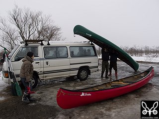 古いワンボックス(25年物だそうです)にカナディアンカヌー2隻と人間9人を積んで釧路川へ。今朝の気温は0度で3月末の気温らしく、樹霜などはまったくなし。残念。現地に着くと、カナディアンカヌー2隻をつなぎダブルカヌーにして出発した。客は、私たち以外に関東から来ている老夫婦。ここの奥さんがよく喋る人で面白い。^^; 関西のおばちゃんとはまた違った味わい。ここから、このおばちゃんと約2時間10キロの川下りが始まる。しかし、カヌーは探鳥には向いてないねー。岸に小鳥がいても川が流れちゃうんで止まれないし、水鳥たちは、カヌーに驚いて飛んじゃう。ロッジはいいので次回も利用したいのですが、今年からカヌーをする客しか受け入れなくなったそうで残念。数年おいてまたカヌーをやりに行ってみようかな。釧路川で観察できたのは、タンチョウ、カワアイサ、マガモ、カワラヒワ、ハシブトガラ、シジュウカラ、カラス、トビ、オジロワシ、オオワシ、オジロワシの巣、エゾシカ、キタキツネなど。相方は、途中口をきかなくなったなーと思ったらグローヴを濡らしてしまい、死にかけていた。仕方ないので私のグローヴを貸し、なんとか生還。
