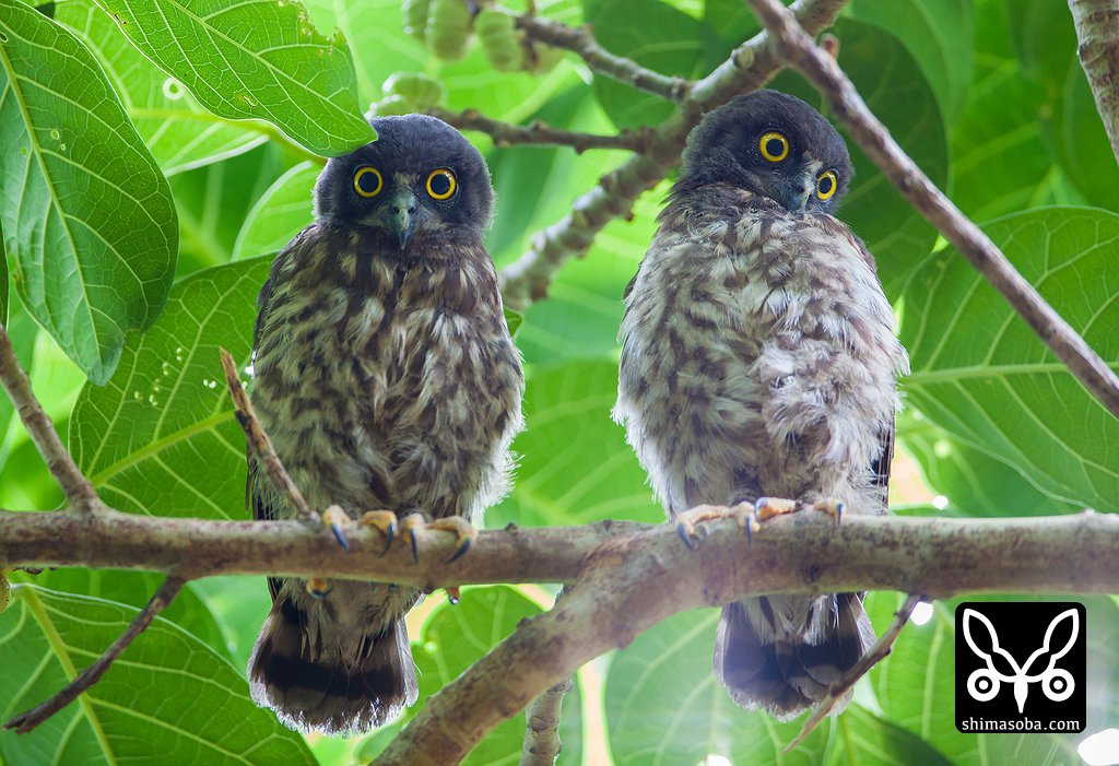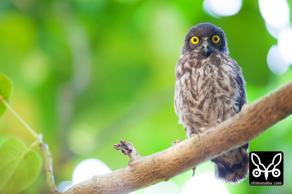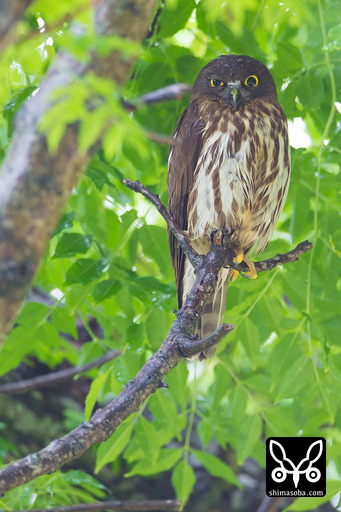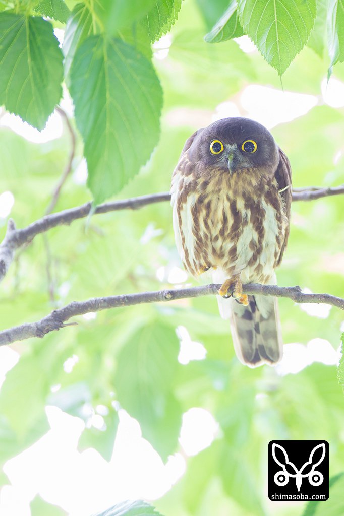 アオバズクのヒナ。炎天下の中、人間の目線ぐらいの高さに止まっていました。夕方には高い木へ移動していました。